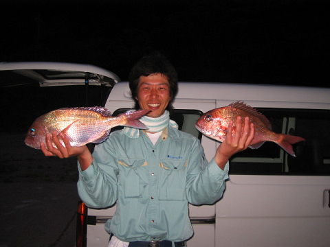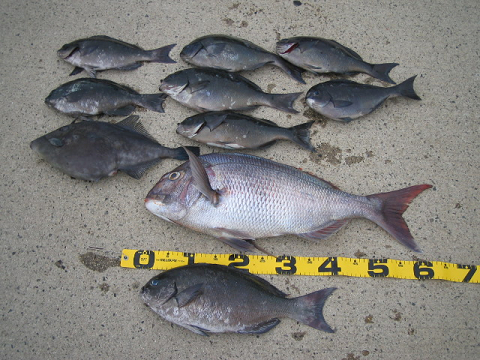 隠岐の島町 脇田さんら2名様 朝から東からの大きなウネリがまわり上がれる磯も限られてしまい久見の馬背へ向かいましたが 先端は完全に波がかぶっている状態・・・ 立島寄りに渡磯して頑張りましたがさらにウネリが大きくなってしまいとても釣り辛い中頑張りました。 真鯛45センチクラス、30センチクラス、カナなど