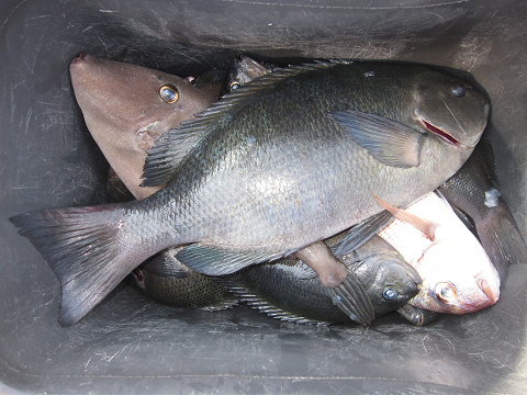 渡礁後早速だが前々日から隠岐入りしていた仲間の宮野さんから釣りたてホヤホヤ石鯛の差し入れ♪